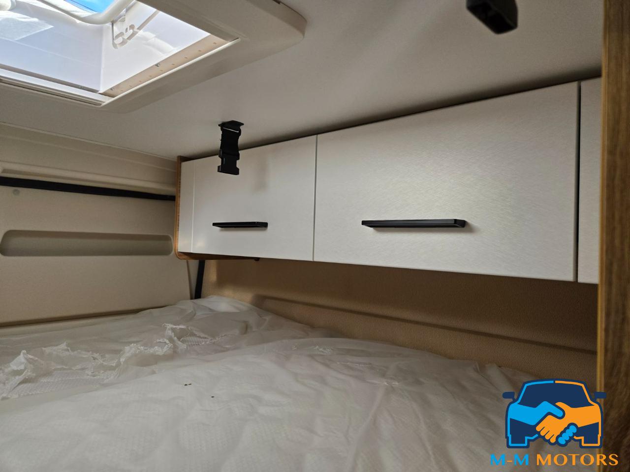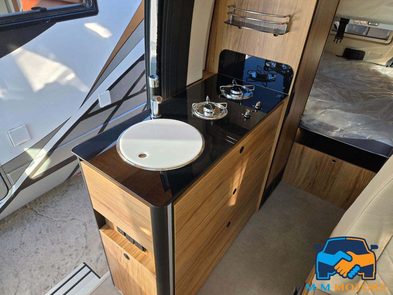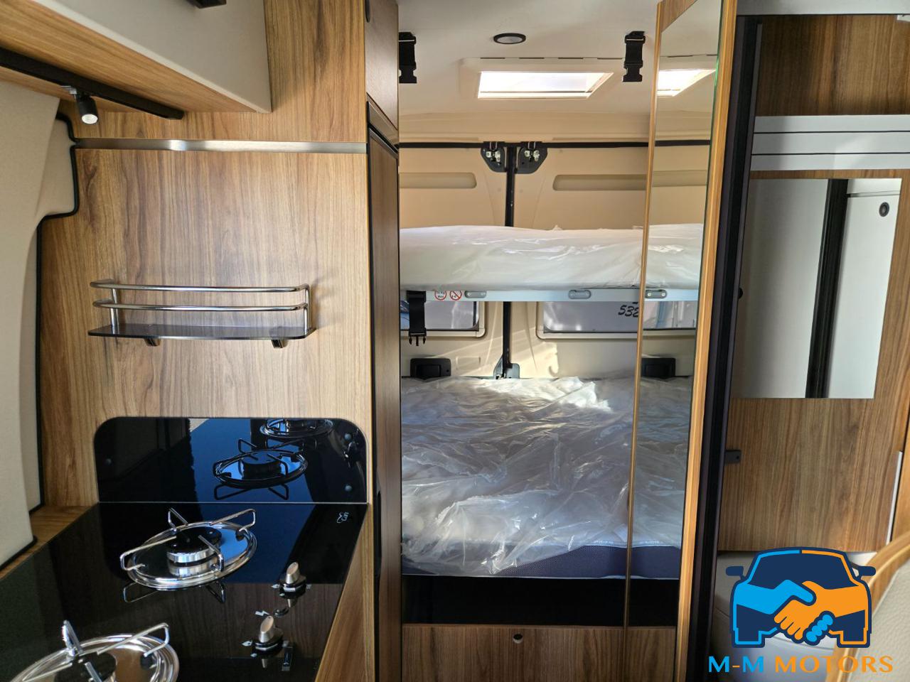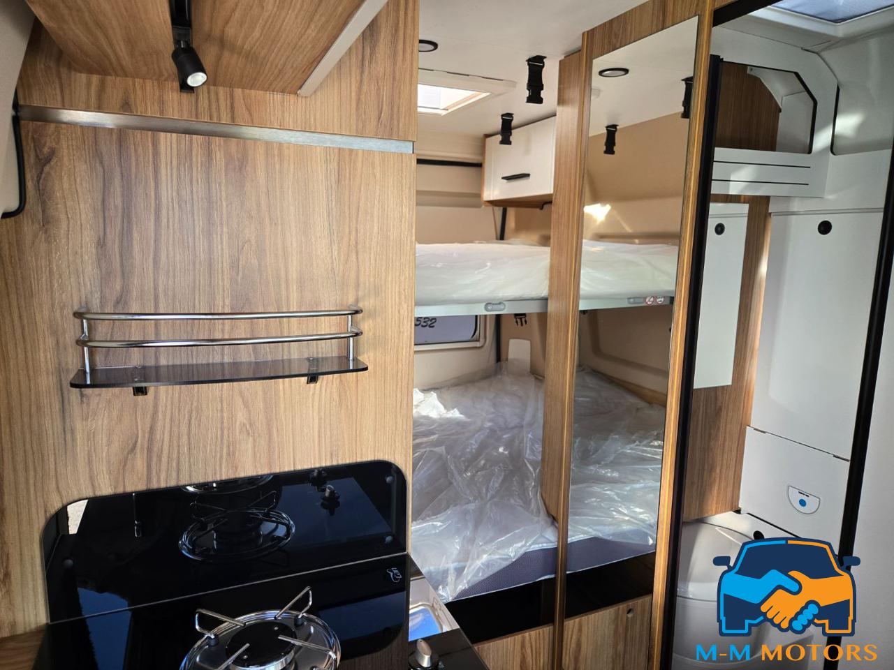 Doccia separata Wc e lavandino Doppio letto in coda Sedili anteriori girevoli Piano cottura a 2 fuochi Arredi moderni e funzionali Ampi vani portaoggetti